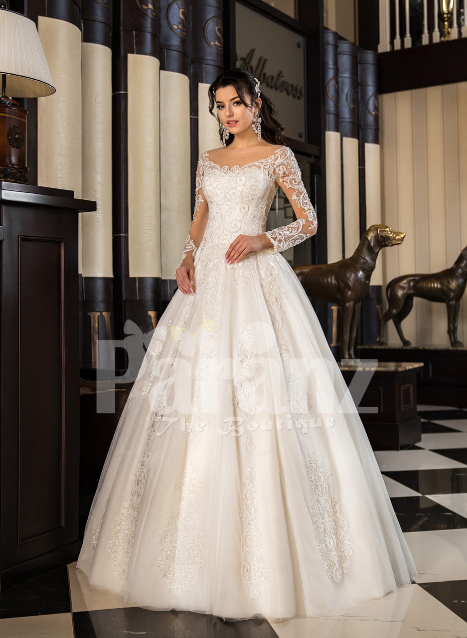 Women’s offshoulder super lacy pearl white tulle wedding gown